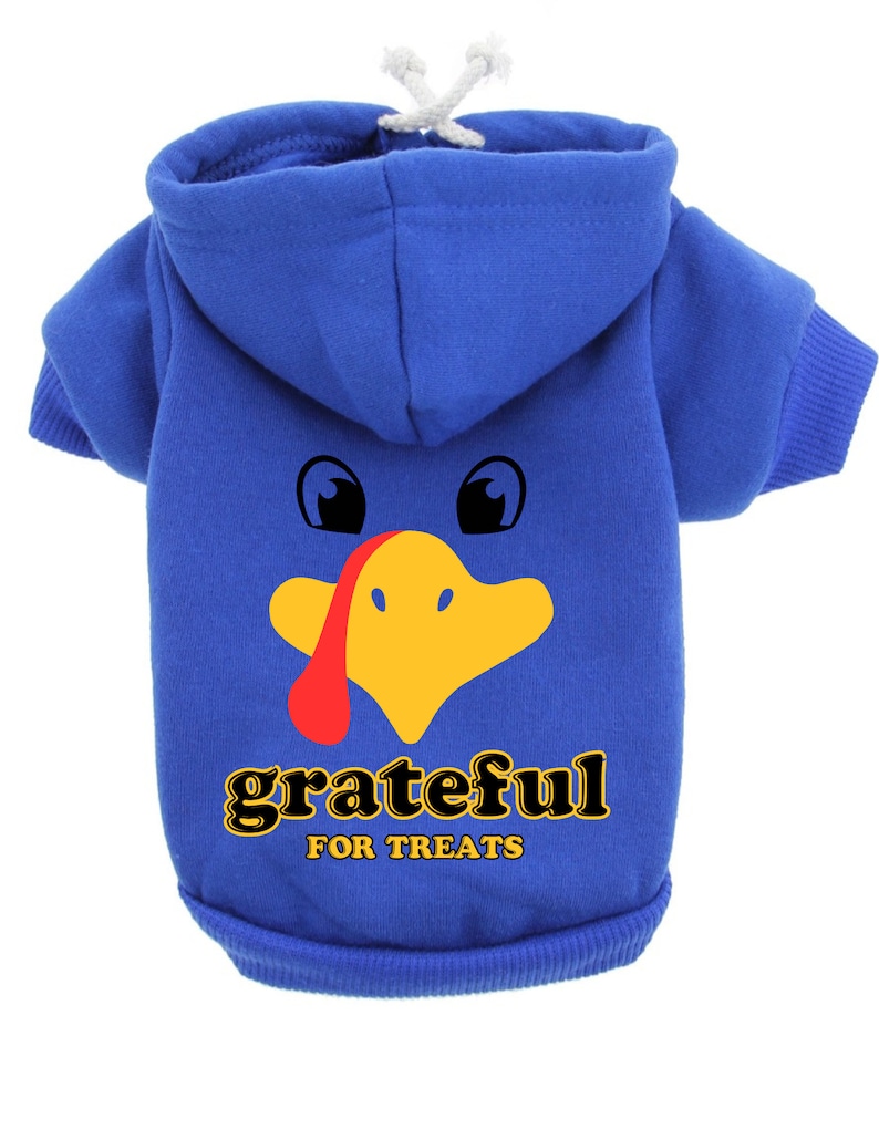 🍗 Thanksgiving Blessings: This pet hoodie is more than just an article of clothing; it’s a heartfelt message of gratitude. With the word “Grateful” and a charming turkey graphic, your pet can share in the joy of Thanksgiving.
